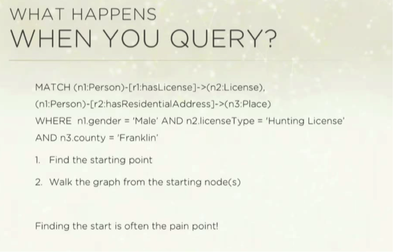 数据库要做的第一件事就是找到切入点(可能有多个切入点),然后图形从切入点展开搜索。寻找切入点通常是个让人头痛的问题。为此要使用带有静态索引集的基于规则的规划程序,这一软件已于近期升级为基于费用。这虽然还不够完美,但无疑已经朝着正确的方向前进了一大步。