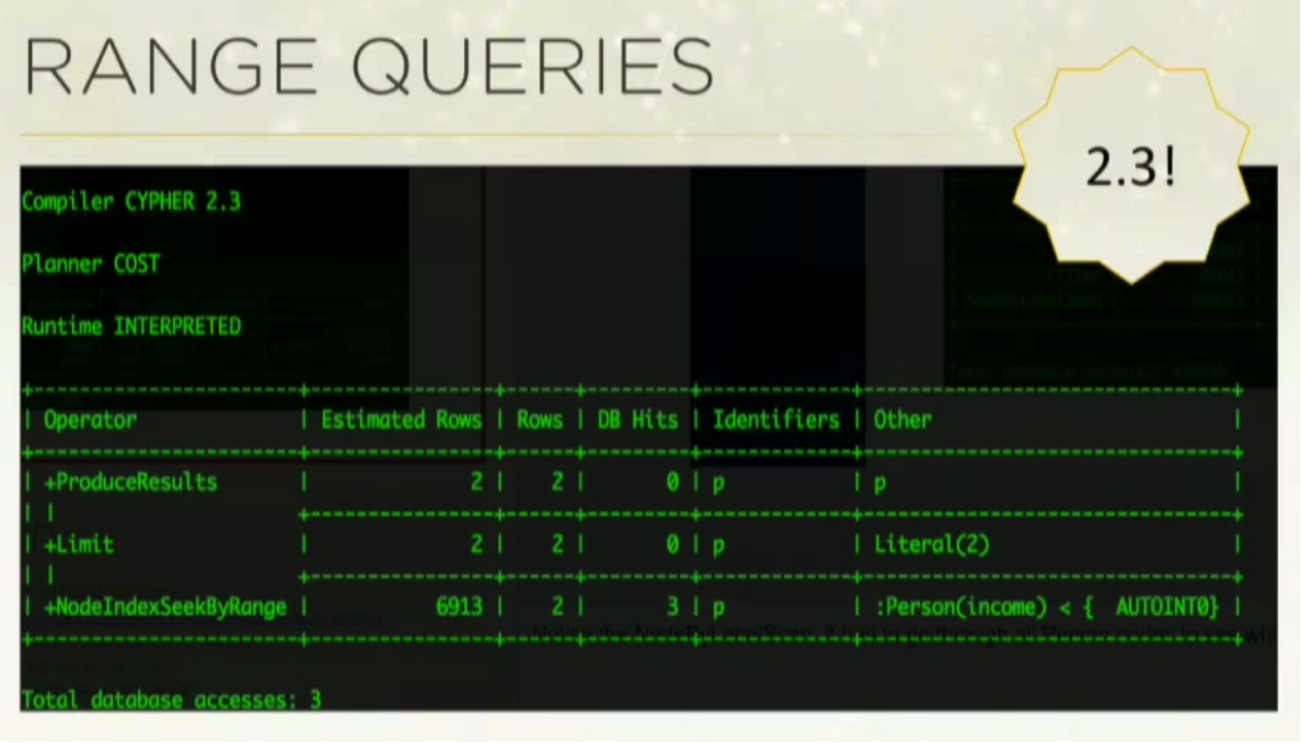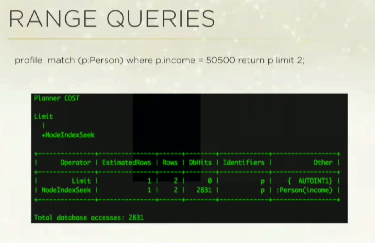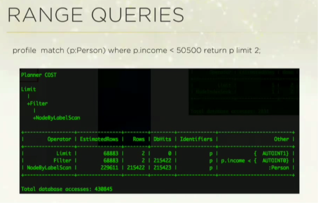 在这次的查询中,我们执行了 NodeByLabelScan,由于没有使用索引,我们进行了多达 43 万次数据库访问。在 Neo4j 第 2.3 版之前,schema 索引不支持范围,所以你必须得用 legacy 索引,然后直接查询 Lucene 索引,才能发挥作用。