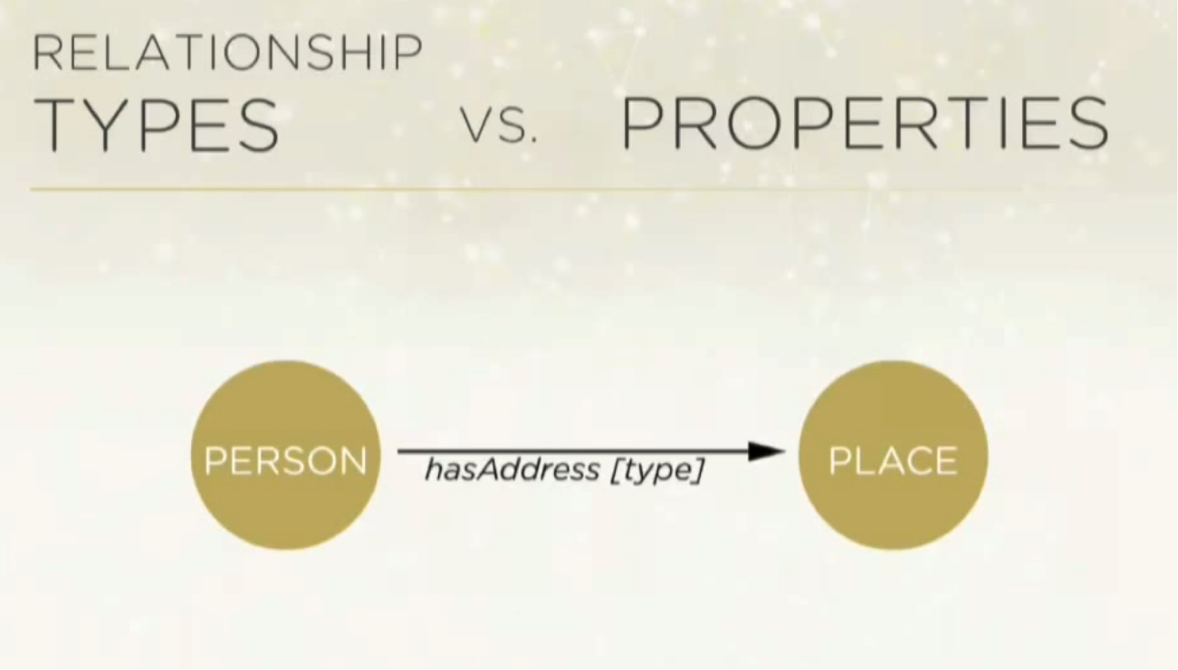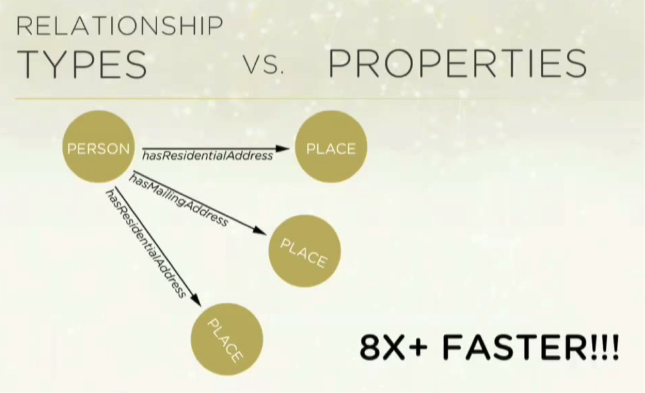 数据模型的重要程度至少和查询相当。下面的说明很有用:可以通过多重关系类型或关系上的属性来为部分关系建模。两种方法似乎同样合理,但它们的性能表现可能大相径庭。一定要了解一下 GraphAware 对这一内容的介绍。其区别在于,一方定义不同类型的 person 和 place 之间的关系……