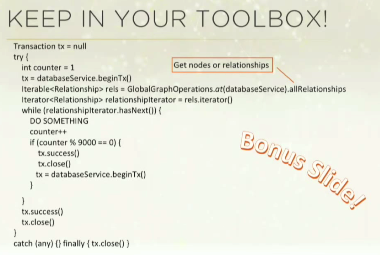 借助下面的样板代码,可以检查数据库中的每个节点并修复所有问题。这一示例有时会抓取关系,但你也可以对节点或其他限定条件进行同样的操作。