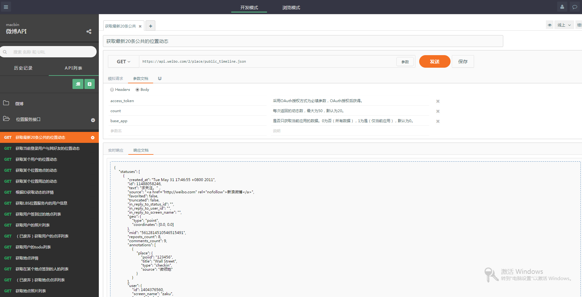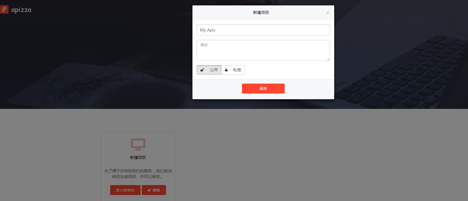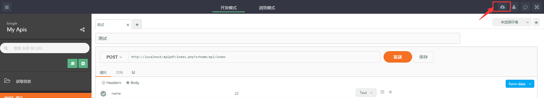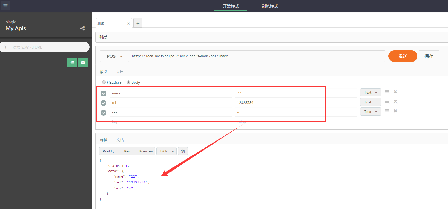 Apizza (http://apizza.cc?f=tp9527) 平台分为开发模式和浏览模板,开发模式只有用户自己可以打开,浏览模式是供其他人查看,测试使用。