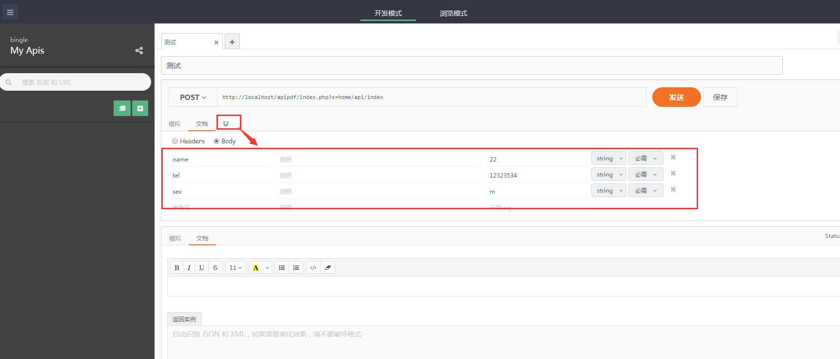 Apizza可以方便的写文档,只要一个按钮就可以把模拟的字段自动生成文档字段。这个功能还是很方便的。