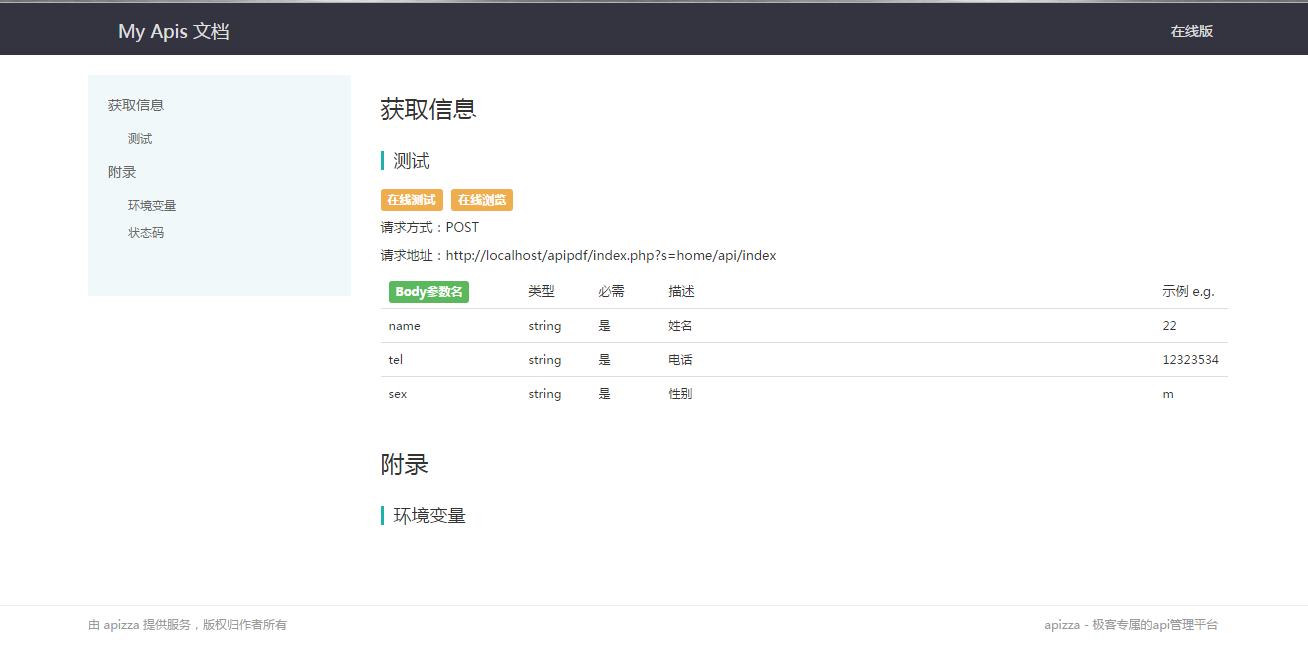 文档地址: http://apizza.cc/console/project/8e0342415ad3df5643409045ec8a5e75/browse?api=adde793df46746cdb0641b014a12ea18
