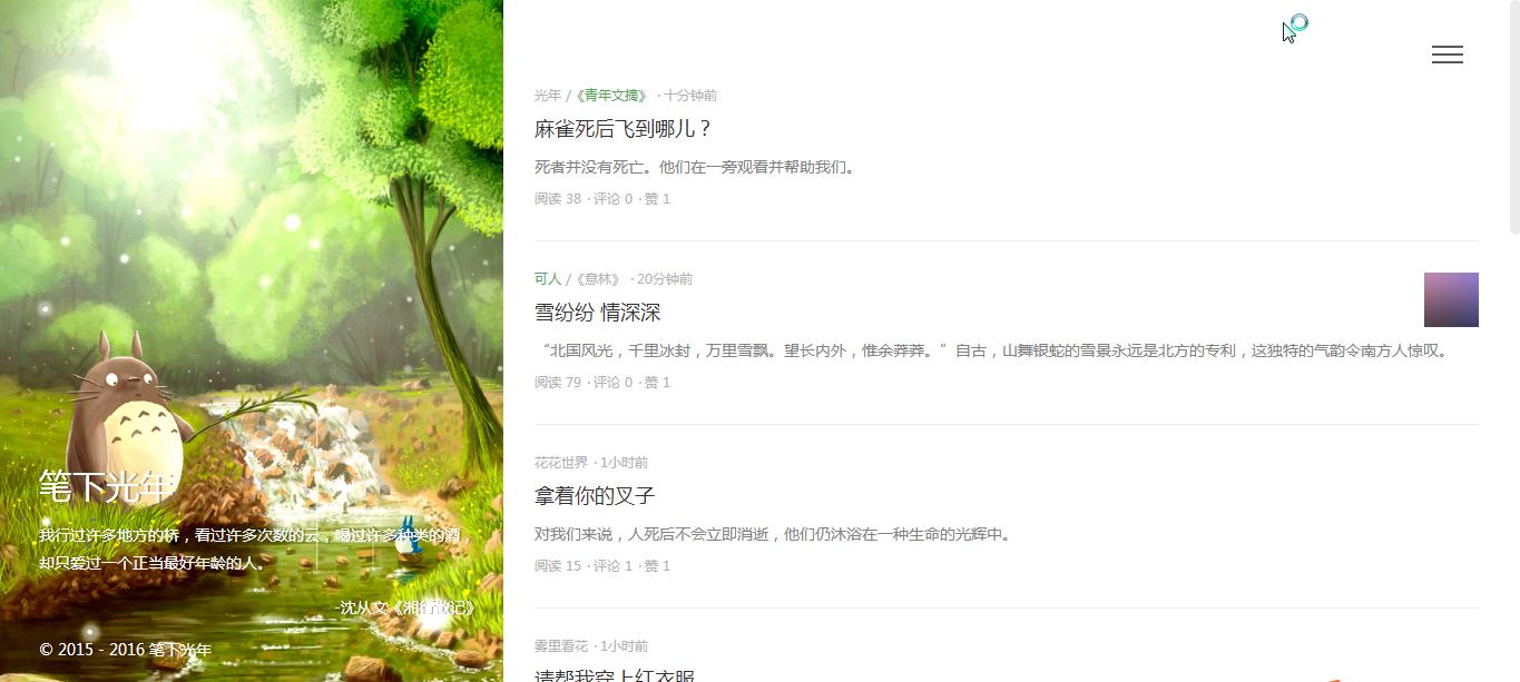 笔下光年 - 是我自己做的一个文章阅读网站,费了不少时间将其改版成响应式的,现将网站的html源码分享给大家,大家有用得上的,尽管拿去,也欢迎大家和我的网站交换友链。