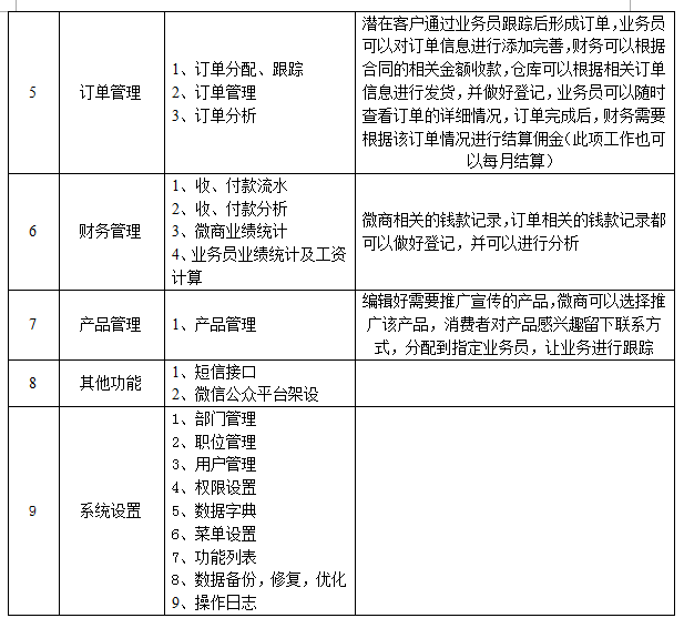 本系统的业务流程,后台设置推广文案,业务员和微商把生成的推广页面分享到朋友圈,获得客户,然后分配给业务员,业务员跟踪,直到成交订单,然后付款,发货,最终订单完成,可以直接给业务员算提供,给微商佣金