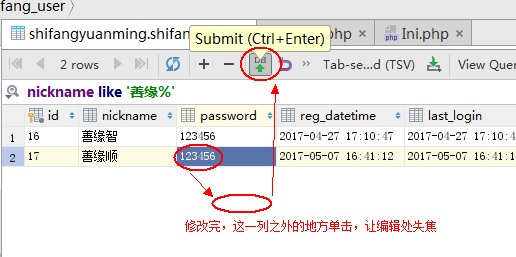 双击要编辑的那一列,输入数据,一次可以修改多个数据,修改完,离开已经修改过的列,然后点击“提交”数据(快捷键:Ctrl+Enter),如图: