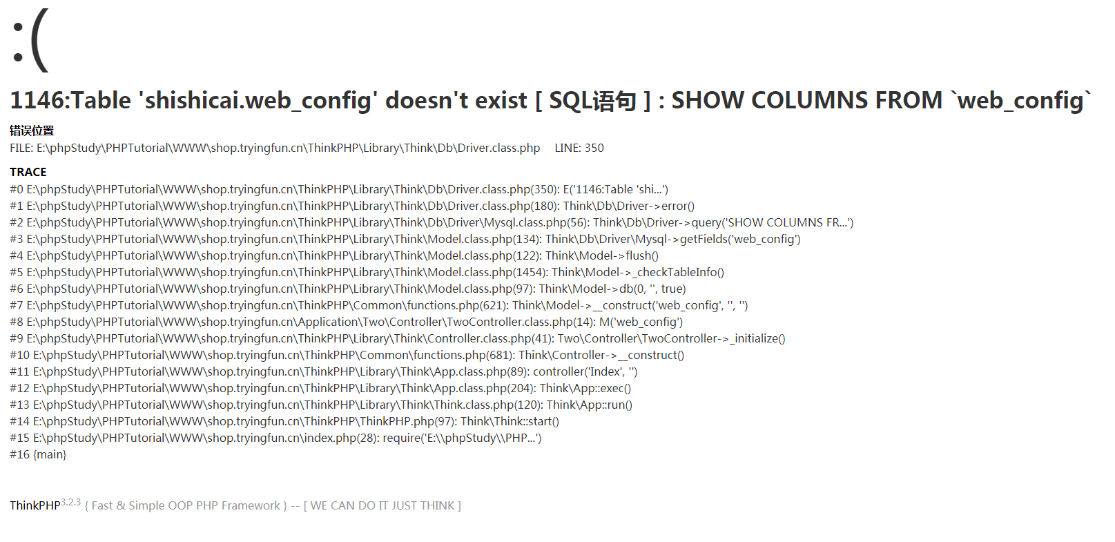 错误信息:1146:Table 'shishicai.web_config' doesn't exist [ SQL语句 ] : SHOW COLUMNS FROM `web_config`