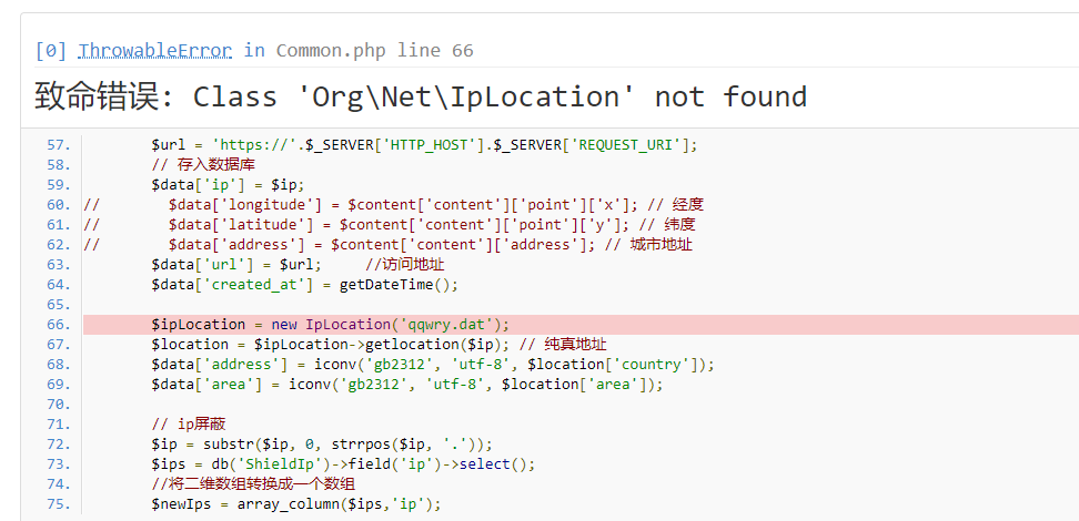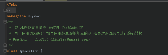 如果所示,按理说应该算是没问题的,为啥调用不了,我用了Loader::import('Org.Net.IpLocation'); 和 直接new Org\Net\IpLocation() 都不行。求解,这是怎么回事