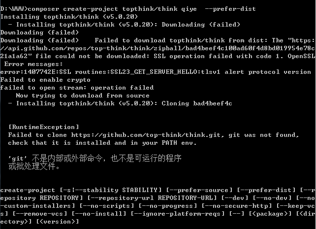 运行composer create-project topthink/think qiye --prefer-dist出现