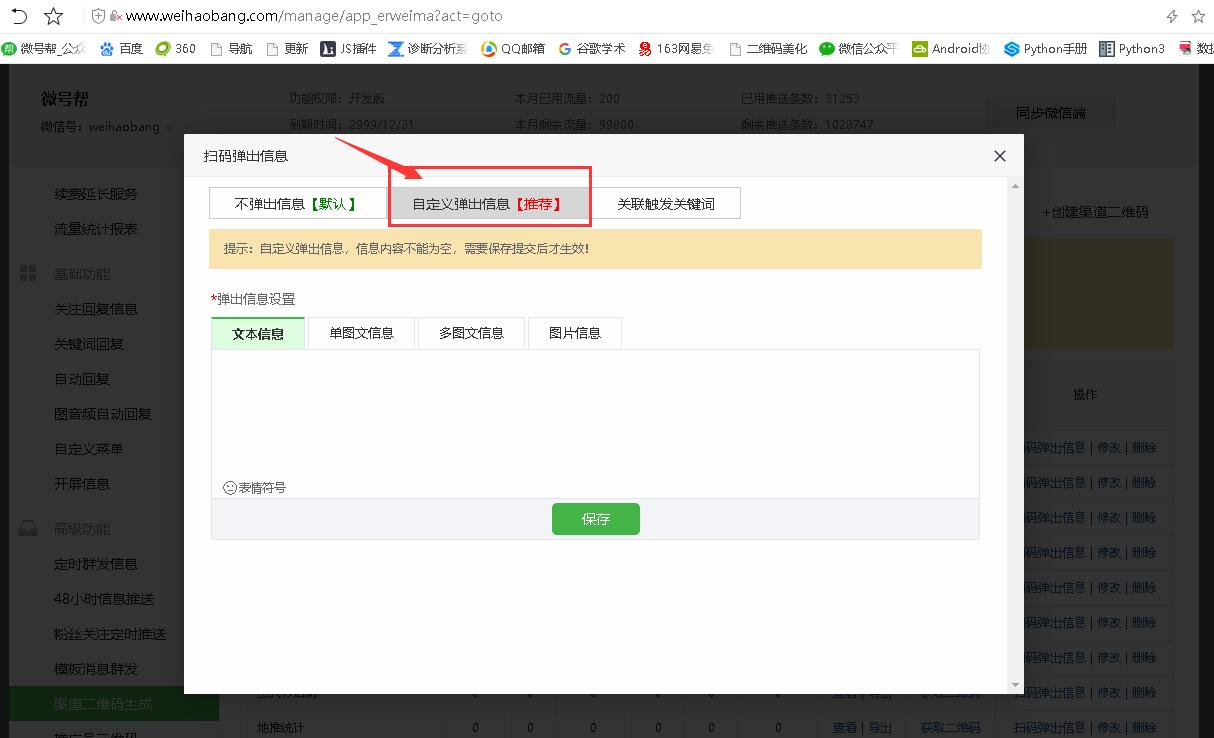 自定义弹出信息,默认微信扫码后不弹出信息!