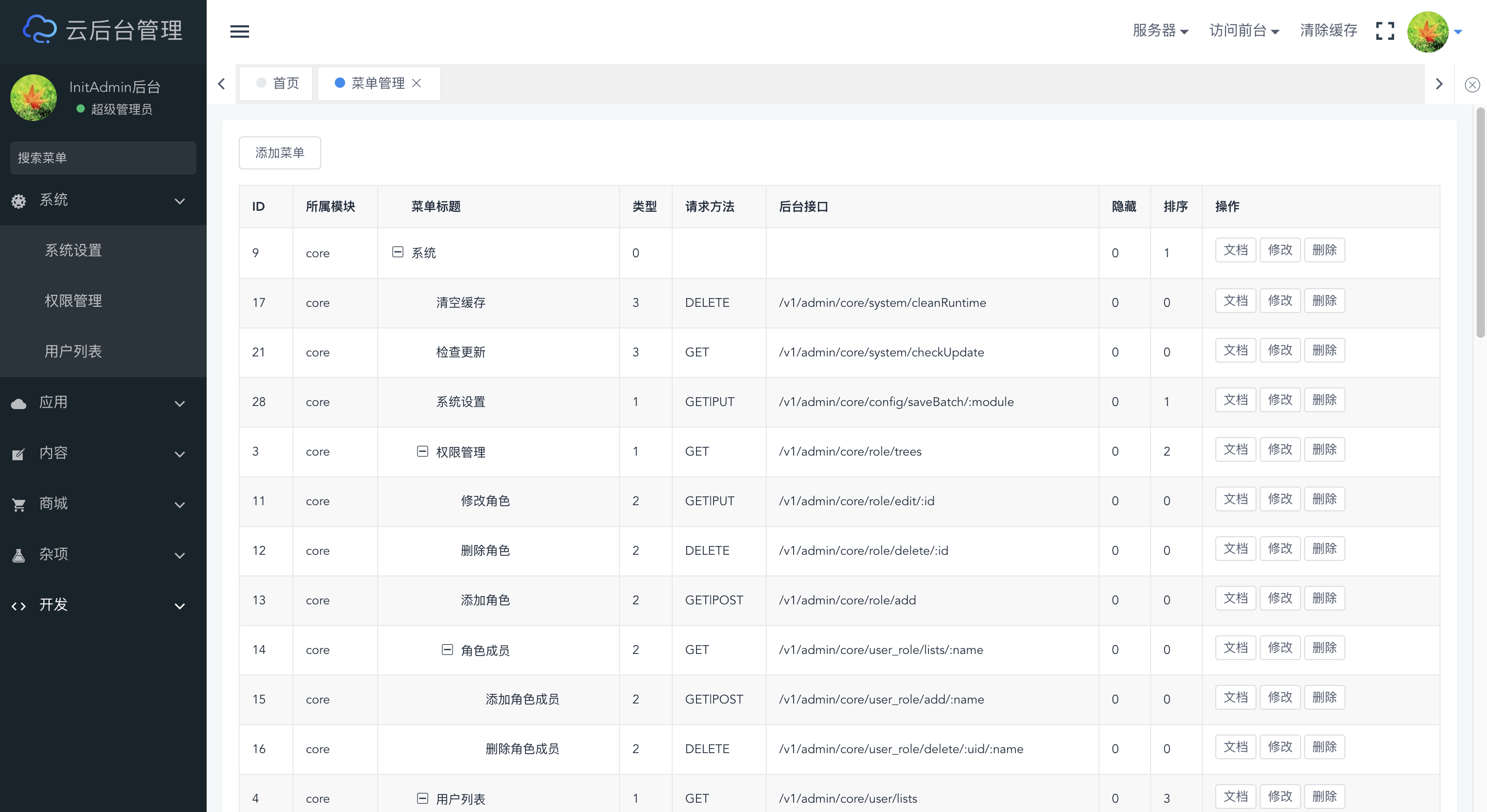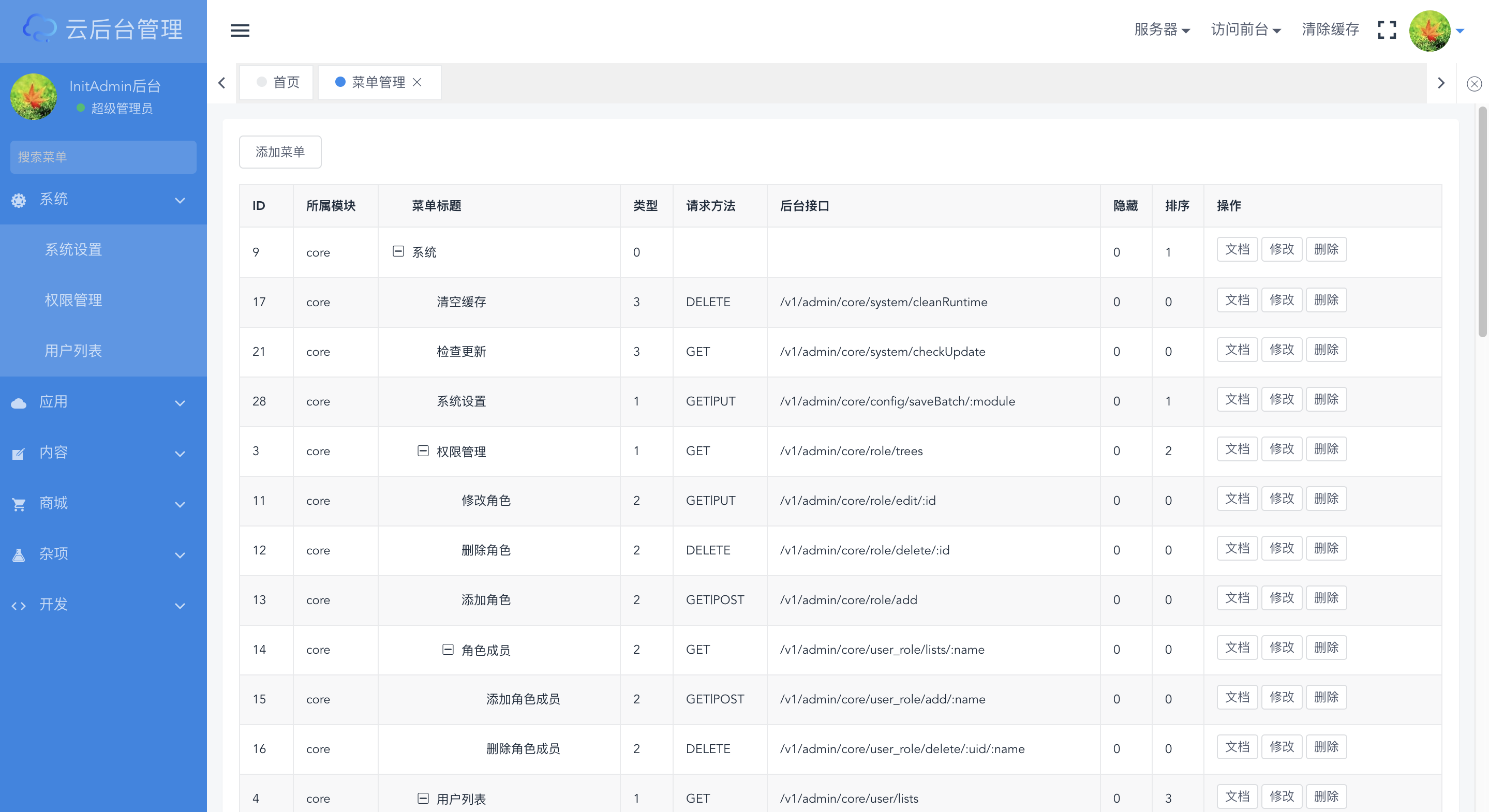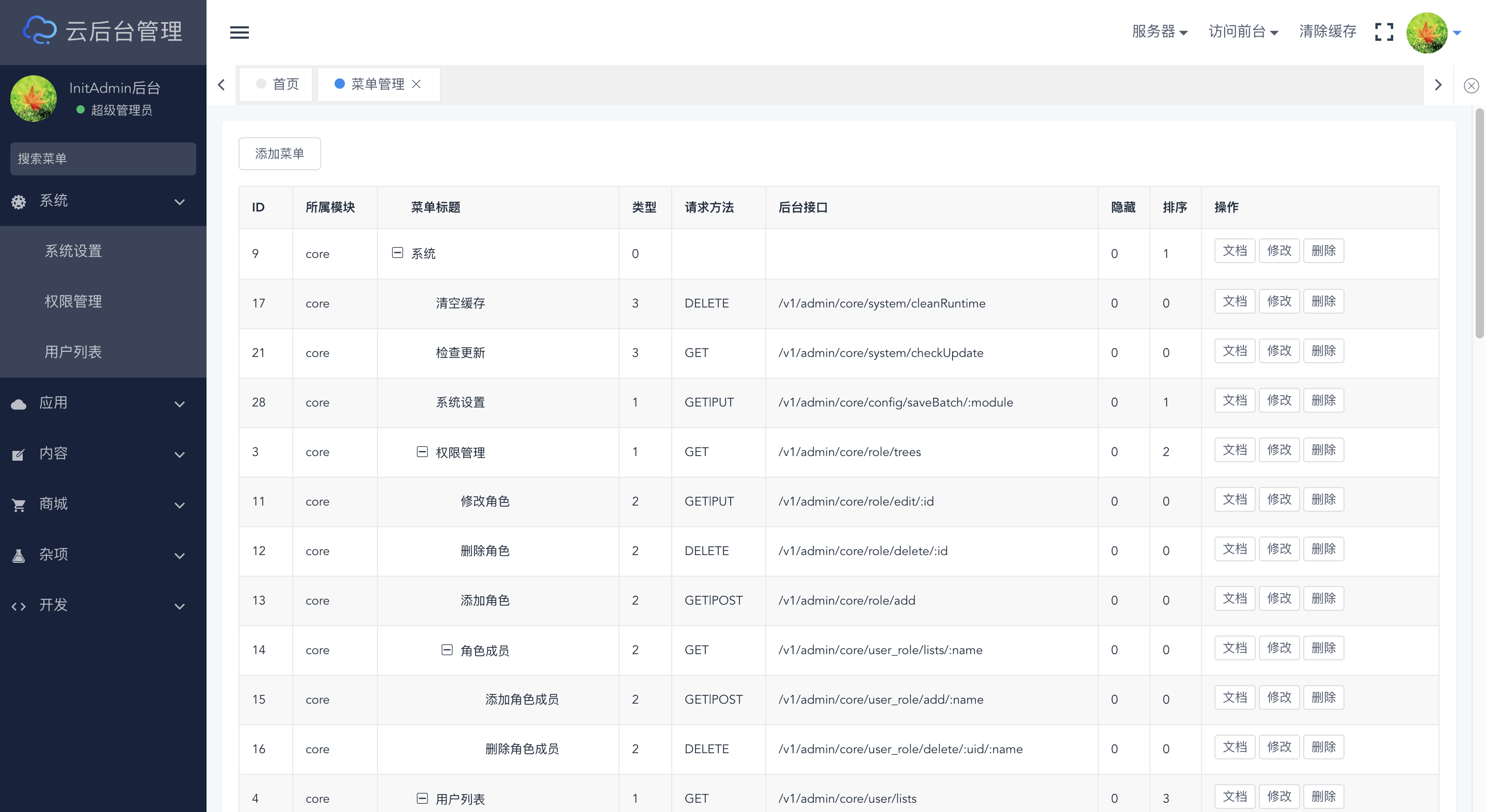 InitAdmin是一套渐进式模块化开源后台,采用前后端分离技术,数据交互采用json格式,功能低耦合高内聚;核心模块支持系统设置、权限管理、用户管理、菜单管理、API管理等功能,后期上线模块商城将打造类似composer、npm的开放式插件市场;同时我们将打造一套兼容性的API标准,从ThinkPHP5.1+Vue2开始,逐步覆盖larval、spring-boot、django、yii、koa、react等多语言框架。