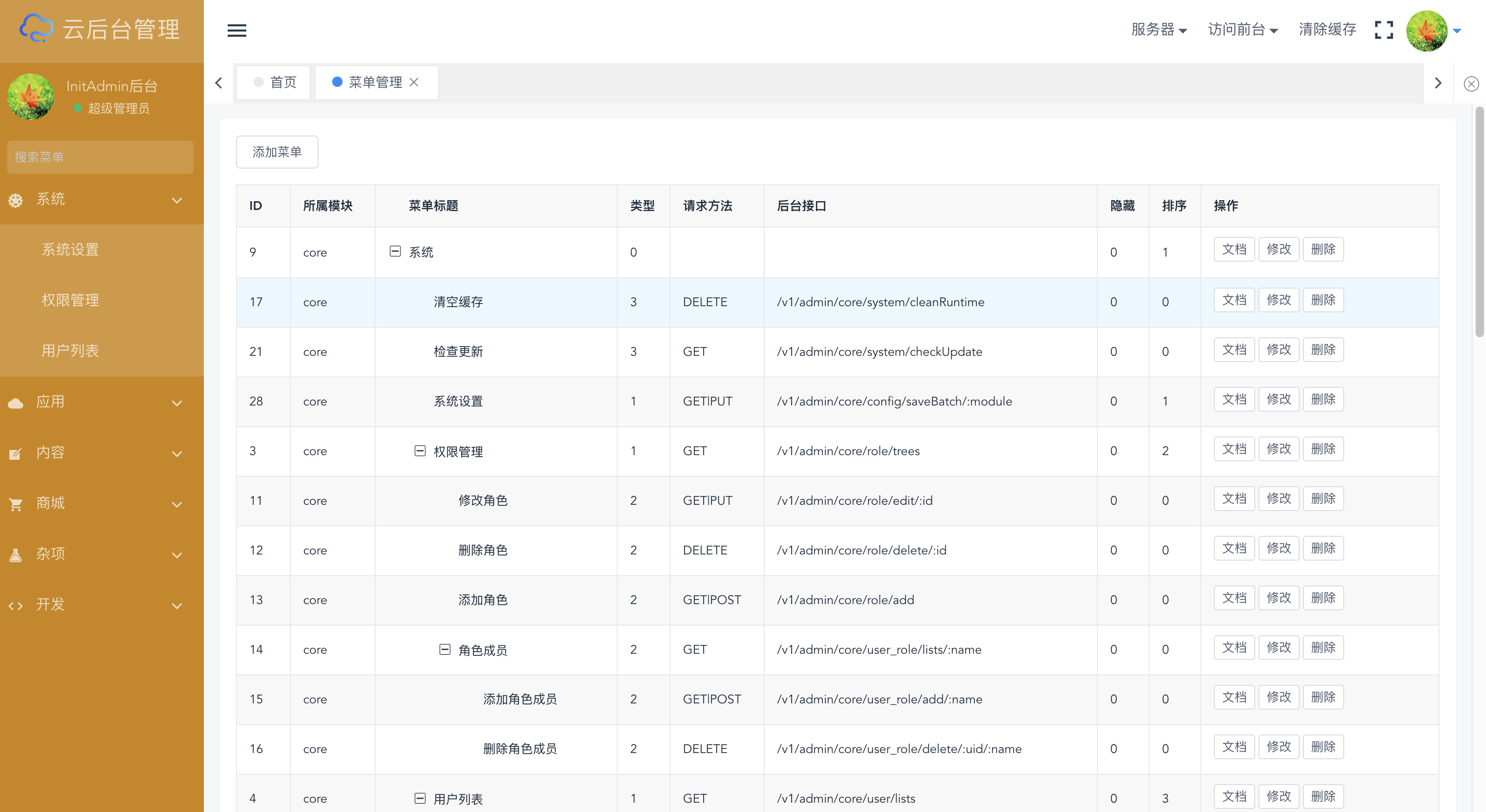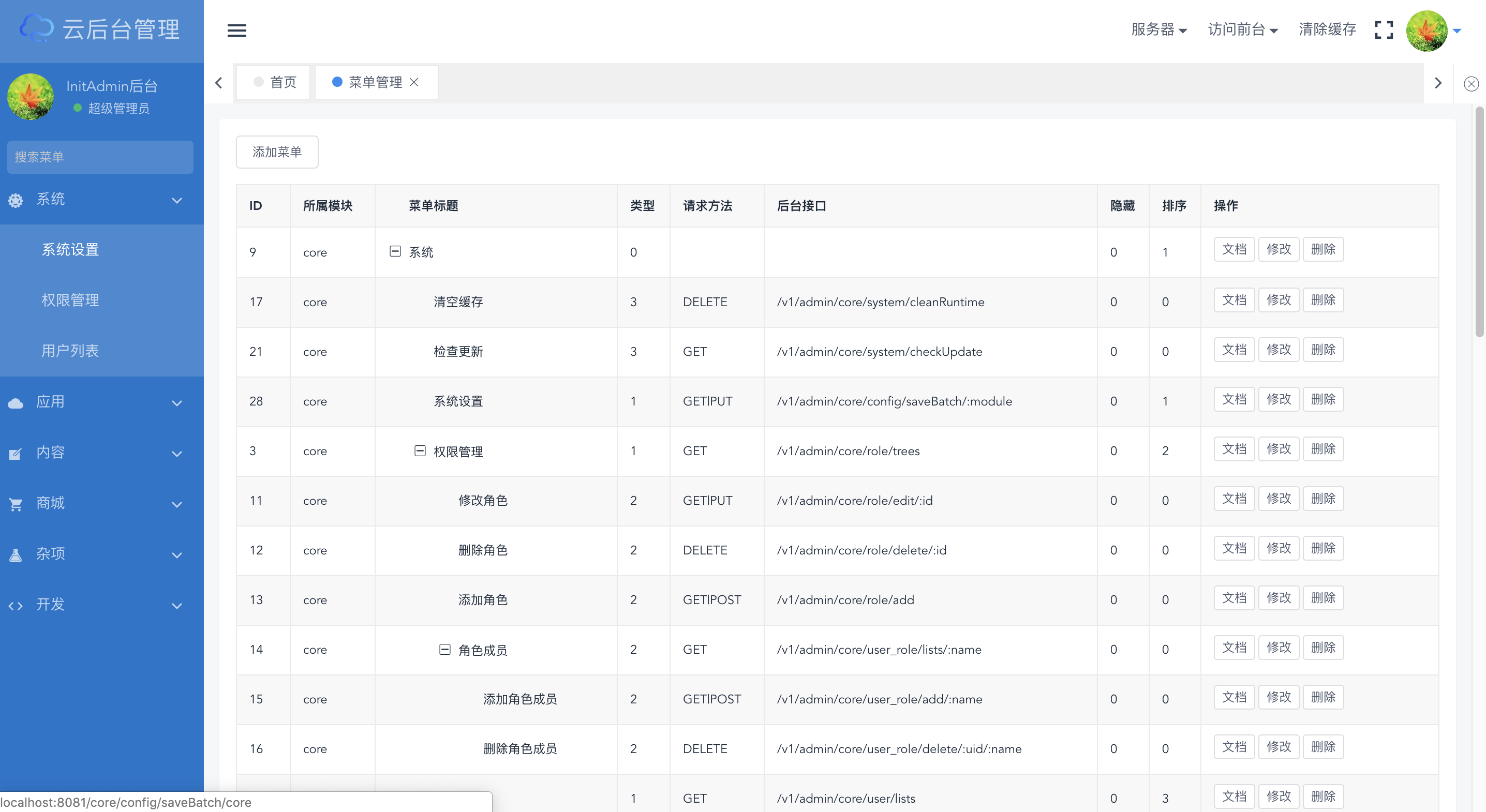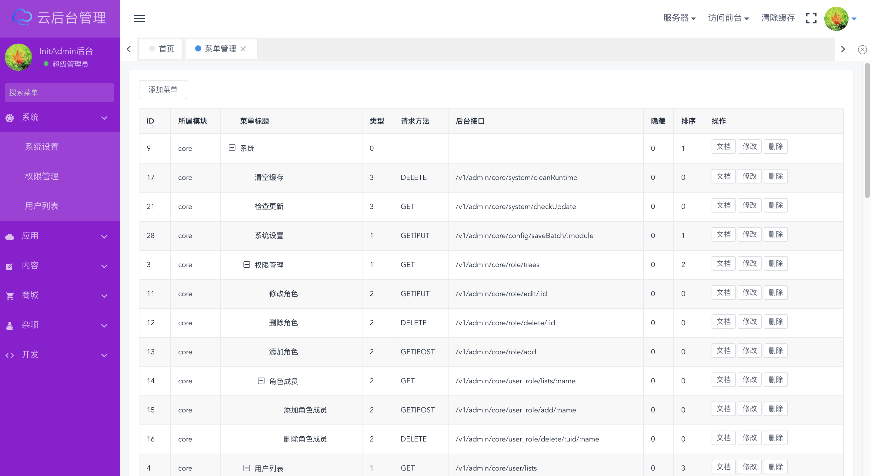 InitAdmin是一套渐进式模块化开源后台,采用前后端分离技术,数据交互采用json格式,功能低耦合高内聚;核心模块支持系统设置、权限管理、用户管理、菜单管理、API管理等功能,后期上线模块商城将打造类似composer、npm的开放式插件市场;同时我们将打造一套兼容性的API标准,从ThinkPHP5.1+Vue2开始,逐步覆盖larval、spring-boot、django、yii、koa、react等多语言框架。
