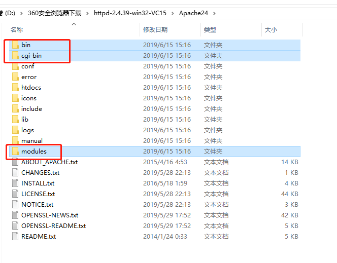 第五步、将下载到的httpd-2.4.39-win32-VC15.zip压缩包解压,把里面的bin、cgi-bin、modules文件夹复制,替换你原来Apache目录下的文件