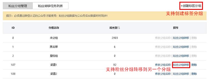 在微号帮后台》高级功能》粉丝分组转移,支持创建粉丝分组、粉丝分组转移、删除粉丝分组,所有操作与公众号后台用户管理标签同步。