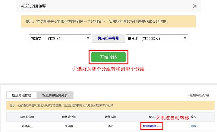 微号帮后台使用粉丝分组转移,批量把公众号粉丝从一个分组转移到另一个分组,支持转移到新分组里,与公众号后台用户管理标签同步。