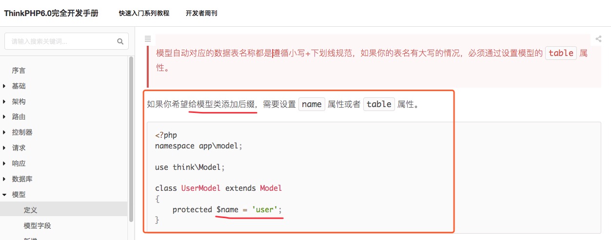 TP6中想创建模型,好像默认的类名是User(如表名为t_user的话),如果希望这个类名能添加后缀如UserModel,按教程似乎要添加protected $name = 'user';