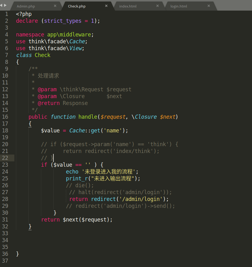 使用think PHP6的中间件来判断用户是否登录,在未登录状态登录时会自动跳转到登录页面, 在跳转登录页面时候,提示重定向次数过多,想问下我这里哪里出错,谢谢各位大佬!
